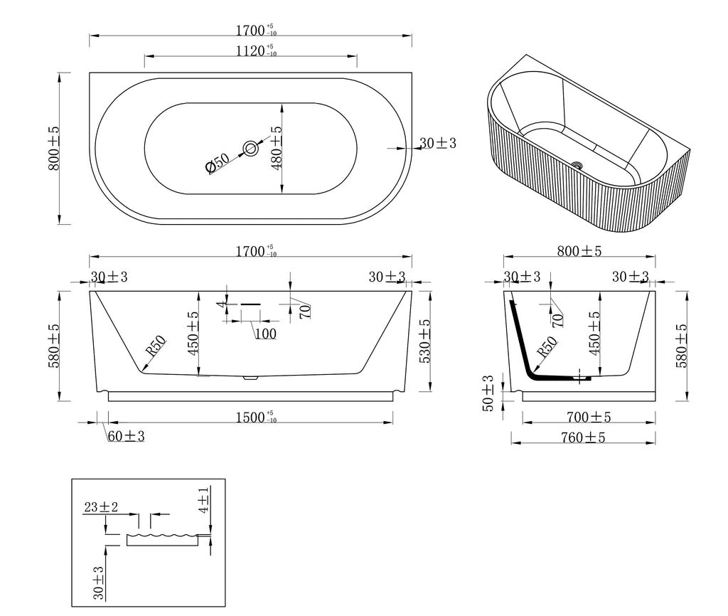 Rivi half vrijstaand ligbad 170 x 80 cm acryl glans wit met waste glans wit