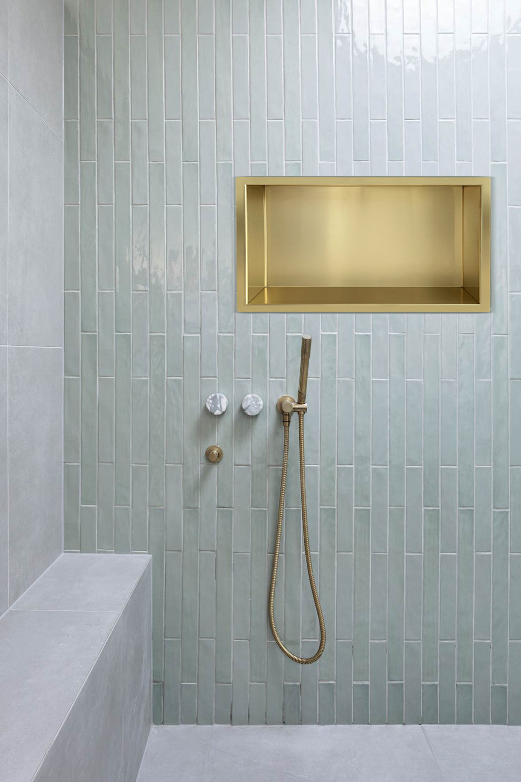 Cette niche encastrée mesure 7 cm de profondeur et est en laiton brossé, ce qui la rend facile à combiner avec d'autres produits en laiton brossé de Wiesbaden Sanitair.