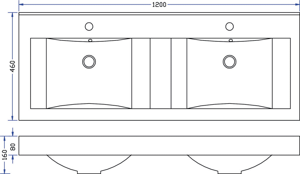 Tigris wastafel dubbel met 2 kraangaten 120x46x8 cm kunstmarmer glans wit
